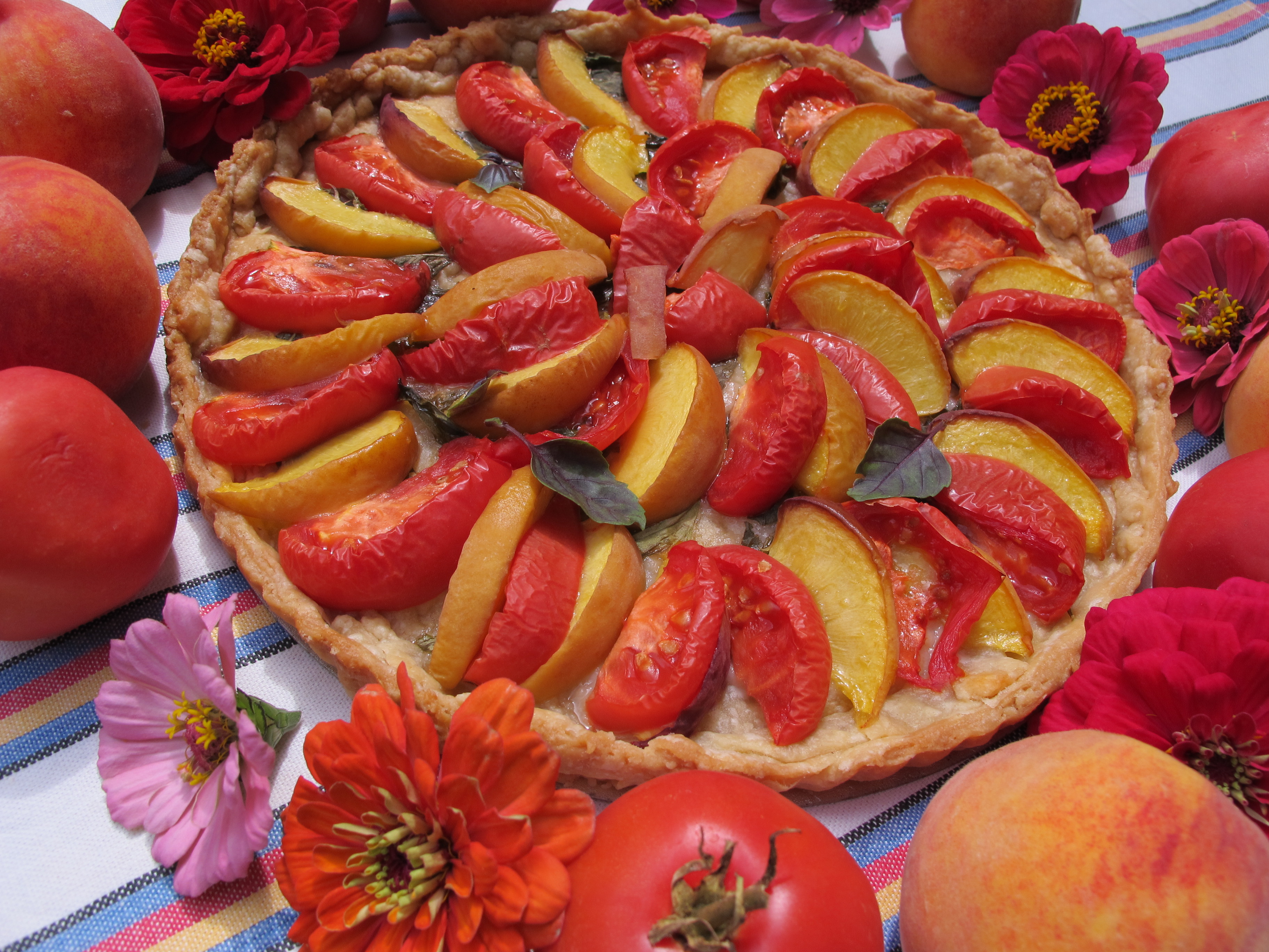 Fuzzy-skinned tomatoes are both a botanical oddity and fun to grow. In past years, Reiss has grown “Wapiscon Peach” tomatoes, an apricot-coloured, midsize tomato whose flavour drew rave reviews. This year, Reiss experimented with “Big Red Peach” tomato , whose size and skin mimicked real peaches. This inspired two tarts, one savoury and one sweet. As an artist, Reiss was drawn to the visual pun of tomato and peach having similar appearances but not eaten or cooked conventionally together. Reiss thought,” Why not combine them in a tart?”
