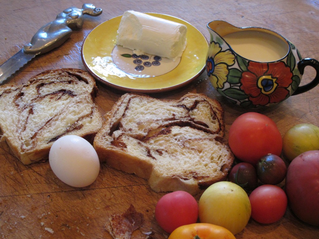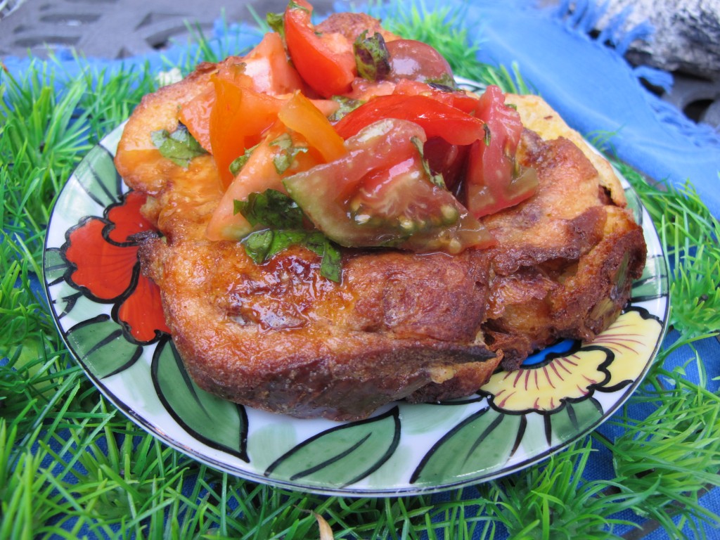This is the recipe I created after last year’s tomato tasting . I used cinnamon bread because the taste of cinnamon and basil are reminiscent of each other.