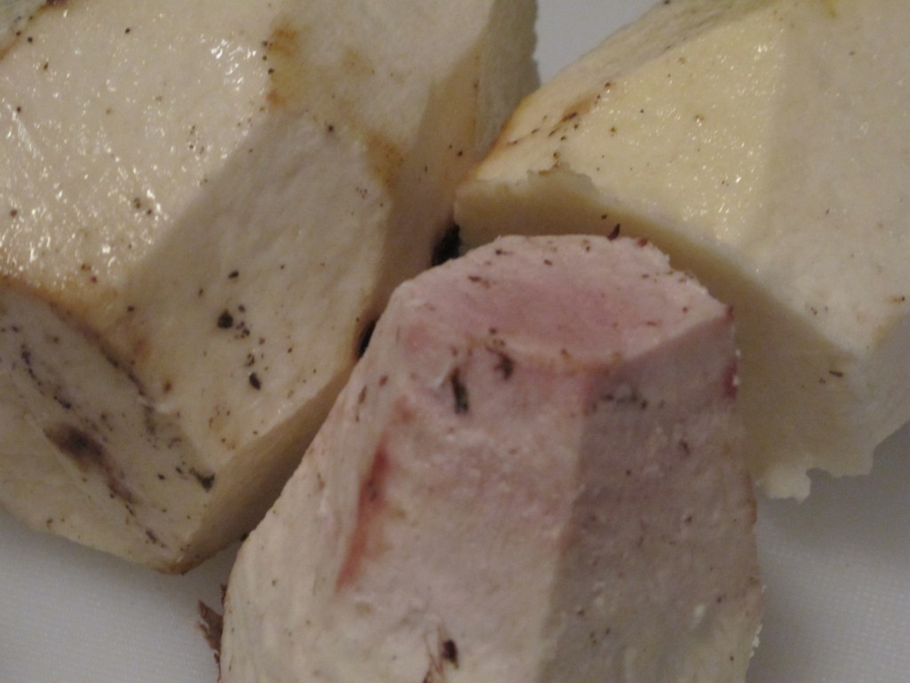 Preparing them at home, the yams were slimy when peeled and raw and the sweet potatoes oxidized quickly.The tania was well behaved. Cooked, the tania was a dense coarse starch and had a faintly floral taste.The yams bland, and not sweet and slimy like the Thanksgiving ones. The taste winner was the local sweet potato. It was very faintly sweet and when boiled and mashed could pass for a chestnut. An interesting idea for the future, to make faux chestnuts if I could find the then, unlocal, sweet potatoes at home in Toronto.