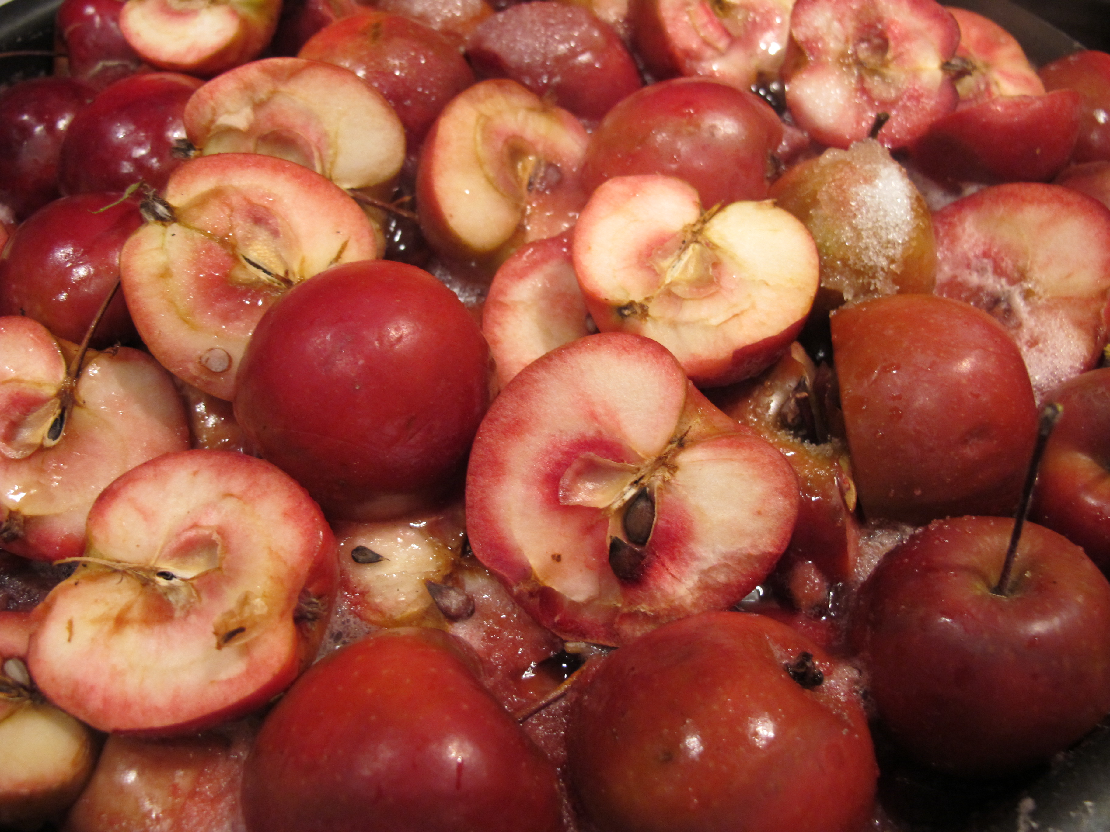 For Simchas Torah, I cooked them whole with sugar and licorice flag from the garden to give the apples a complimentary anise flavor. Sukkot, they were sliced in a mandolin, revealing their rosy flesh, and lined on lettuce leaves for a salad. Canadian Thanksgiving they were pickled whole with rosemary that had grown beneath the apples in the planters.