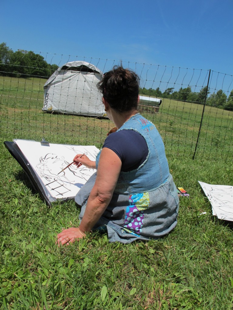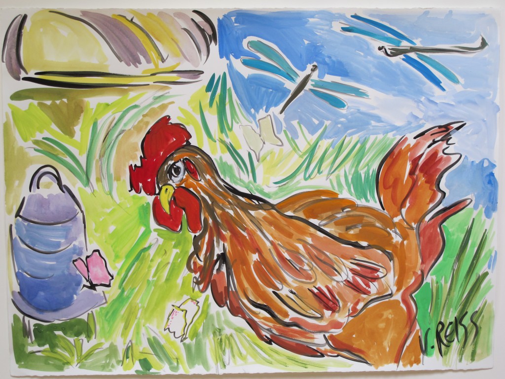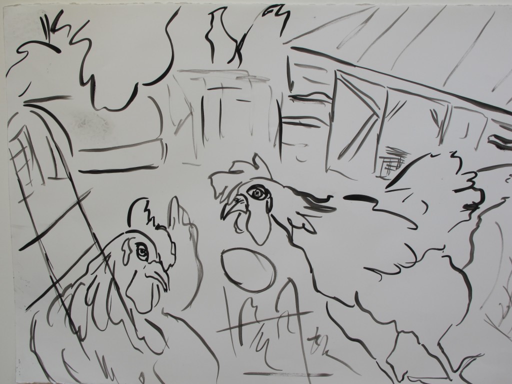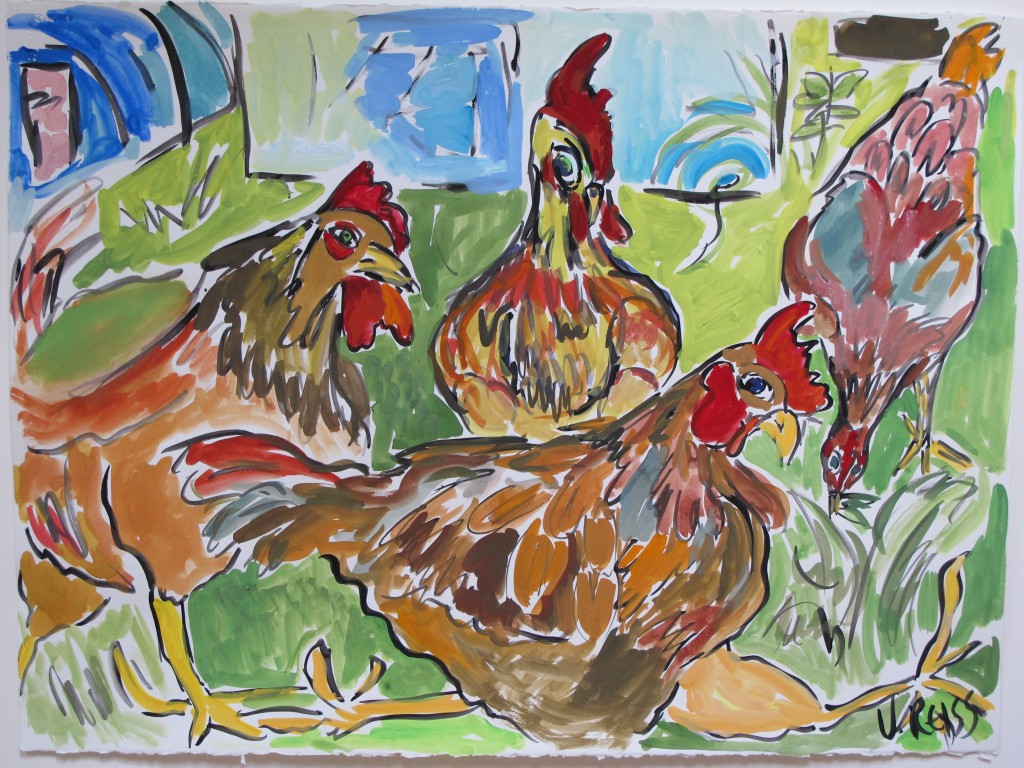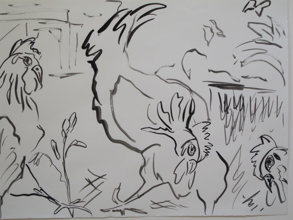 I asked permission to capture the chickens on paper and set about painting. Here are the results.