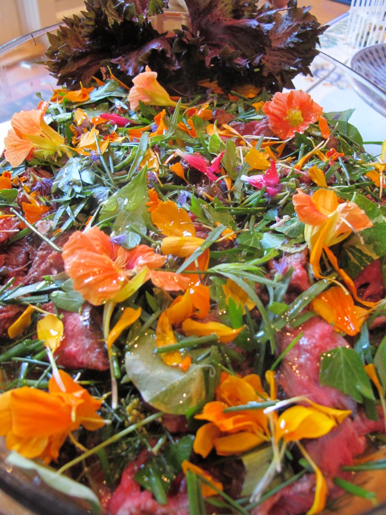 Last month on a tour of the Medieval Gardens At The Cloisters, the uptown branch of the Metropolitan Museum of Art, the docent paused in the herb garden to tell us of the Medieval cooks ‘ love of salats. That is salad to us. Many herbs , flowers, greens were used. Lettuce was not always the main ingredient. Bitter greens were popular, probably for their digestive properties .Foodstuffs in that era were sometimes “past their prime” .It made me think of beef and my garden. We age beef , not rot beef , so the adding a bitter quality to our meals is not important . I had just been looking at The Unicorn Tapestries. I realised that I could recreate a tapestry of flora from my garden.Thus this “Salat” was born.