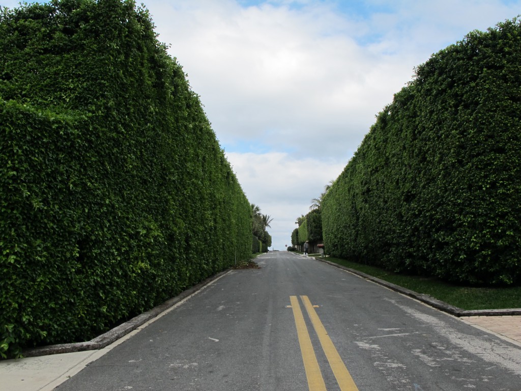 In midieval San Gimignano tall towers were the symbol of wealth and power. Eventually there were 72 such structures rising ever higher in this Tuscan hilltop village. Today few still remain. In Palm Beach, Florida such symbols are thriving and are indeed literally living testaments to it’s denizens modern day power and wealth. Let me introduce you to the Palm Beach hedge. Palm Beach has wisely ensured that it’s essential character be preserved by imposing a height limit on it’s mansions. The only way to be taller than your neighbors is in its distinctive hedge culture. Do Palm Beachers think that hedge fund is a gardening term?