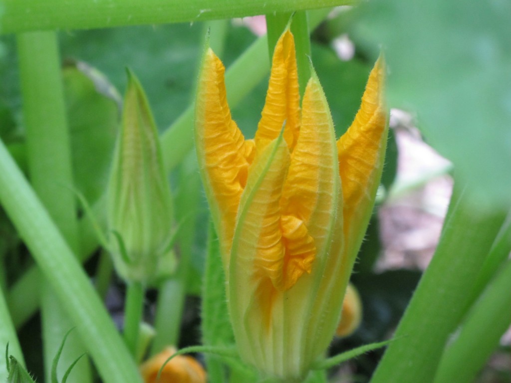 In the third quarter of July, I noticed a little empty space in the garden leading to the house. It was a stubborn piece of earth. In that spot, I had tried several times to germinate watermelon seeds and seeds from particularly delicious melons I had just consumed. Nothing grew. That tempting piece of earth did not seem fecund. I bought a packet of “Cocozelle Squash” described as, “a striped Italian beauty; the race car of the vegetable garden.” And fast it had better be, as it was late in the growing season. I was hoping not so much for squash, as for blossoms to stuff, batter and fry. I planted several seeds on the spot.