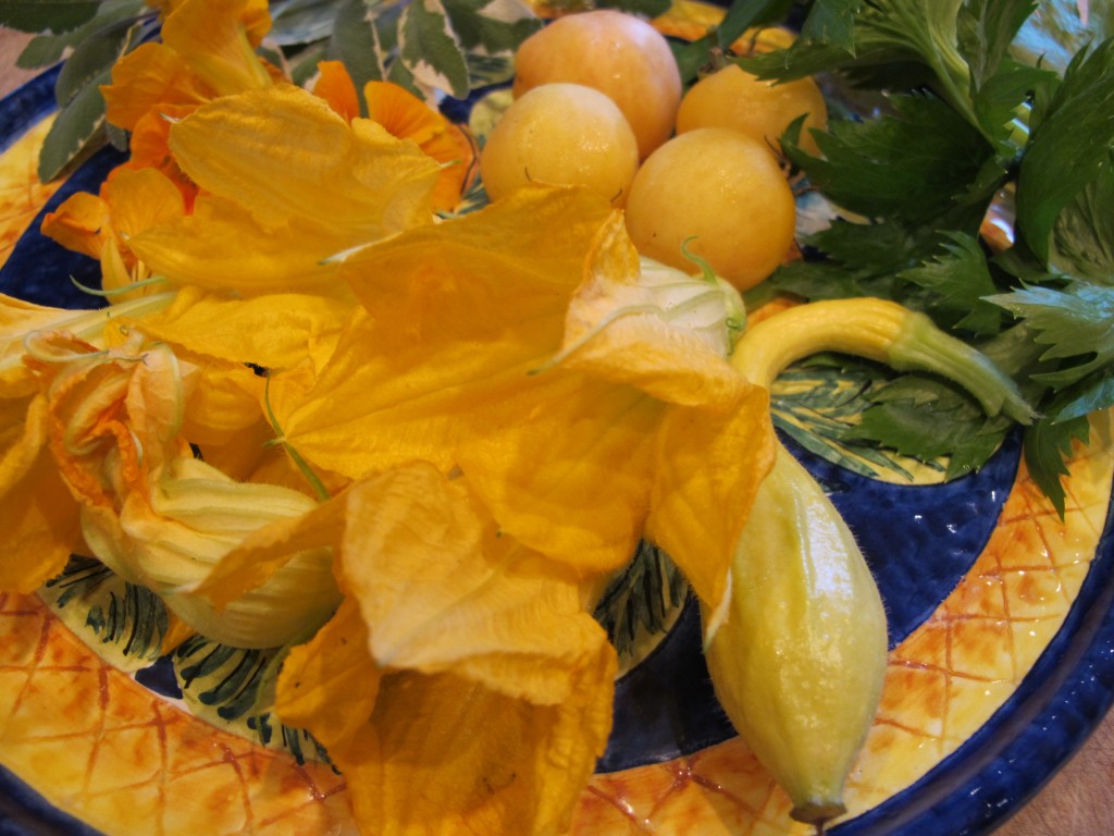 I gathered the squash blossoms, the tiny squash, variegated sage leaves, yellow nasturtiums and “Wapiscon Peach” tomatoes; named for their yellow fuzzy skins, from my garden.