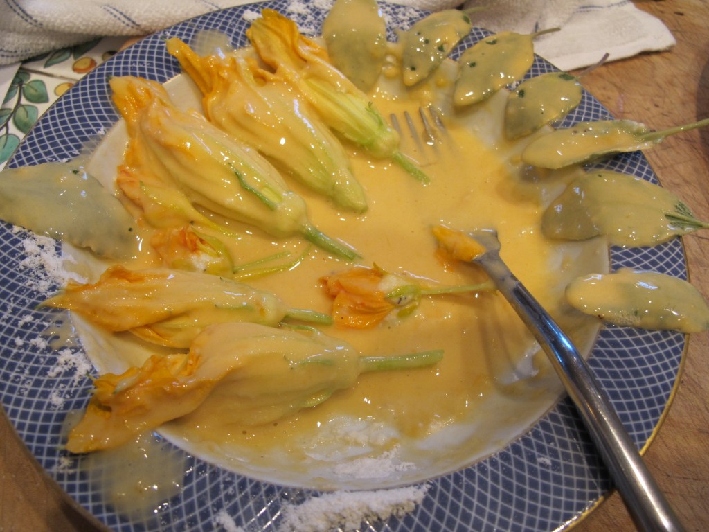 First make the batter: Beat one egg, adding a grating of nutmeg and salt to taste. Mix in 1 tbs. flour and 1 tbs. of water. Mix until incorporated. This will make an eggy batter in keeping with the sunshine theme of this dish, but you could use any batter recipe. I have also used tempura batter mix to coat and fry all manner of herb leaves for an easy appetizer.