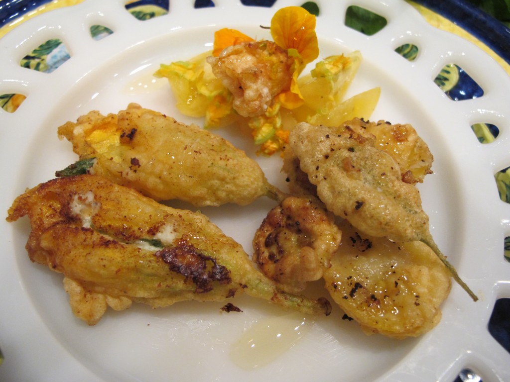Battering and frying: Coat the cheese-filled flowers, squash rounds, sage leaves, and tomato rounds with the batter. The blossoms tops should be gently twisted while battering to seal in the cheese. The tomato rounds should be lightly dusted with flour before dipping in the batter.